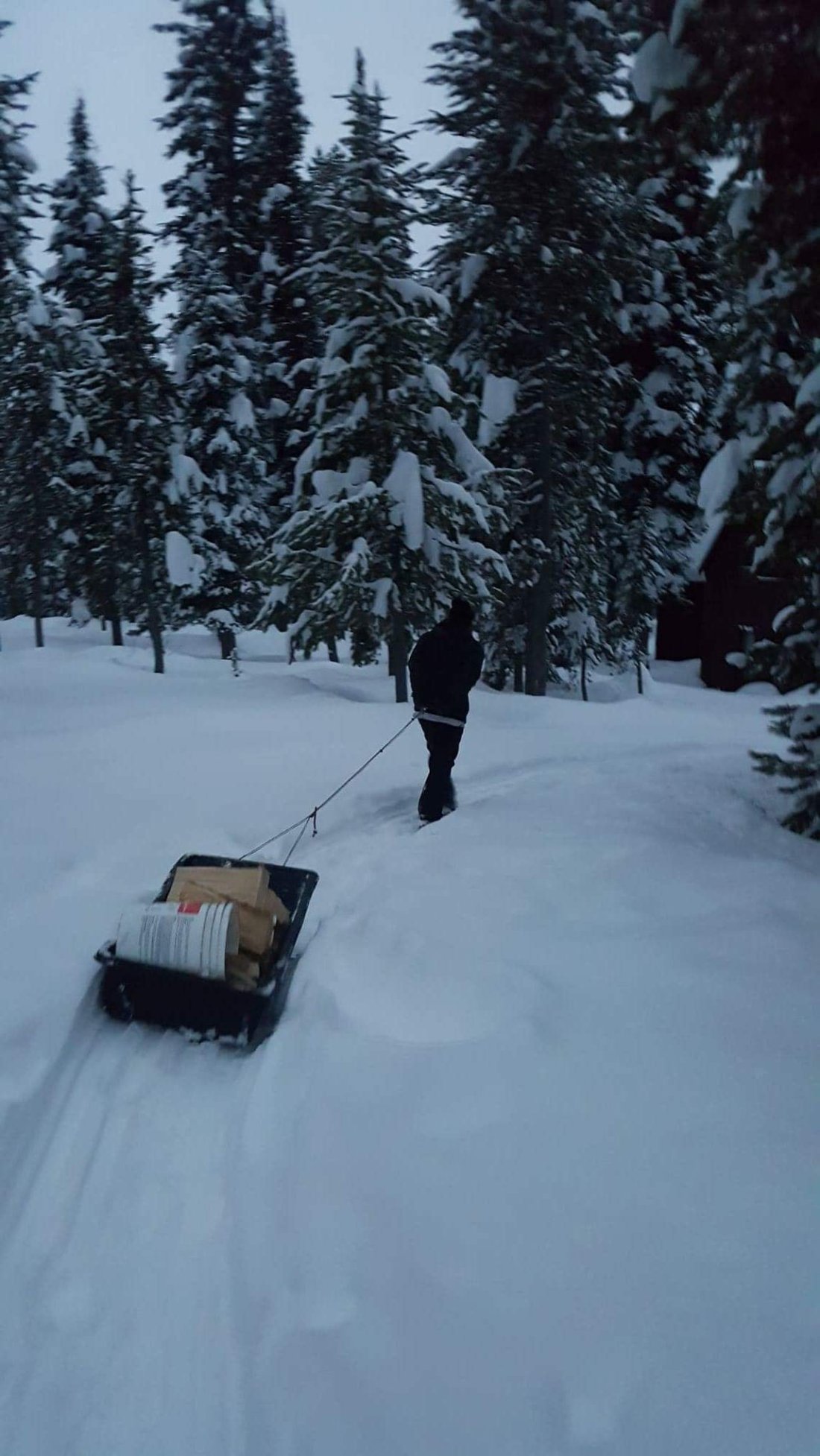 When we need to move things about camp, we do it by loading up a black industrial toboggan and pulling it behind us. It greatly simplifies trying to carry things about.